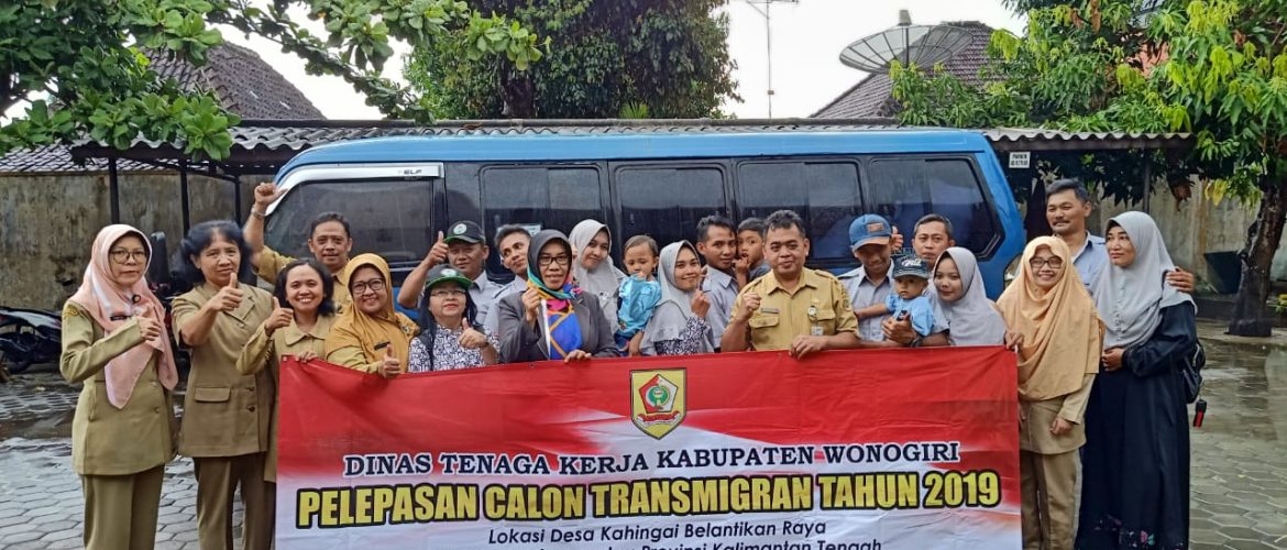 PELEPASAN CALON TRANSMIGRAN DARI KAB. WONOGIRI KE KAB. LAMANDAU, PROV. KALIMANTAN TENGAH TAHUN 201917/12/2019 di BIDANG / Kegiatan / PENEMPATAN TENAGA KERJA DAN TRANSMIGRASI Oleh⣠Admin Naker (diperbarui 2298 hari lalu) Penerimaan bantuan dari Baznas Kab. Wonogiri dan Disnaker Kab. Wonogiri pada hari Senin 16 Desember 2019 Foto para calon transmigran Kab. Lamandau Prov. Kalimantan tengah bersama dengan Ibu Kepala Dinas Tenaga Kerja Kab Wonogiri dengan para staf